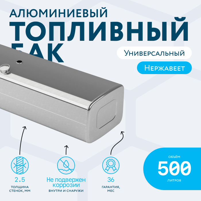 Для марки МАЗ соответствует размерам оригинала и может быть установлен на штатное место, с применением имеющегося крепления. Топливный бак нашего производства изготовлен из сортового алюминия увеличенной толщины 2.5 мм. Для дополнительного усиления прочности бак оснащен ребрами жесткости в виде четырех внутренних перегородок, приваренных по периметру, основная функция которых — это обеспечение плавного перетекания топлива и нейтрализации гидроударов.